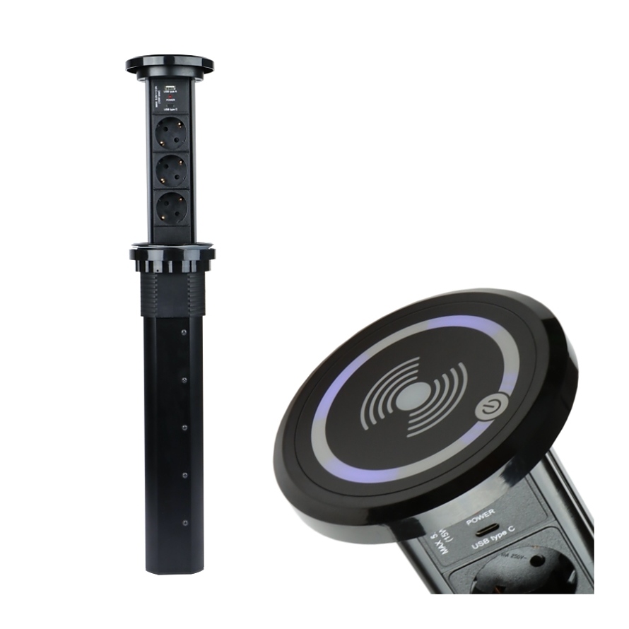 Автоматичният LIFT BOX с индуктивно зареждане е модерен и практичен мебелен контакт, който се побира в кухненски или офис плот с прибиращ се панел. Предлага се в черно и разполага с: