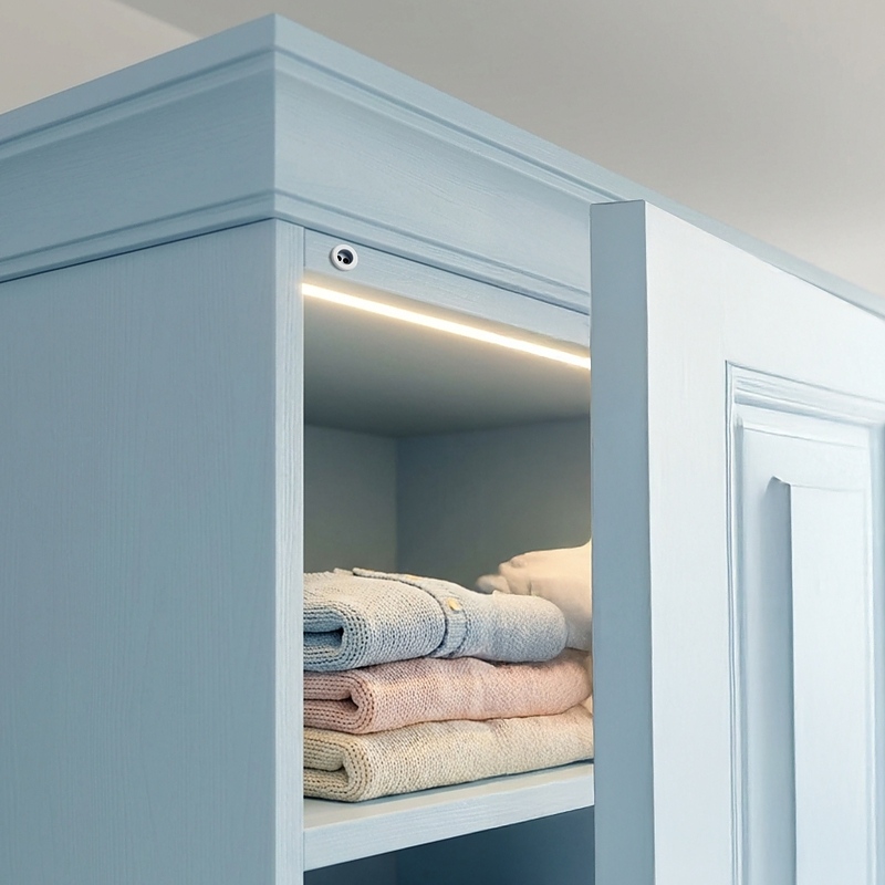 LED светлината се включва автоматично при отваряне на предната част и се изключва при затваряне , което елиминира нуждата от традиционни механични превключватели.