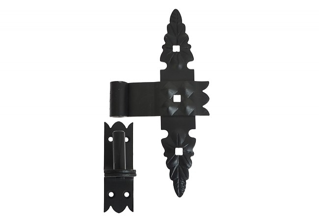 Централна панта за портали, вратички и дървени врати. Ширина 40 см, височина 32 см, ширина на колана 5 см. Декоративен, черен лак. Цена за 1 бр с накрайник.