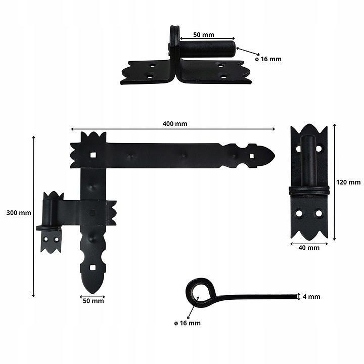 Комплектът включва: 4 ъглови панти с рамена 30x40 см, монтажни куки