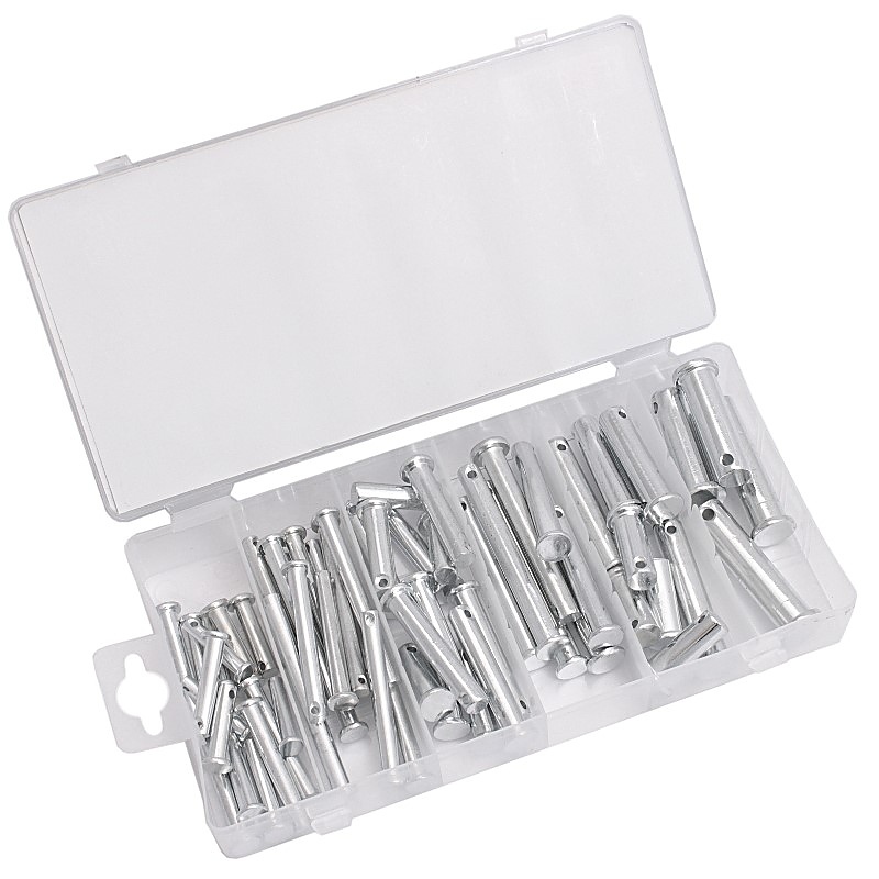 Комплект щифтове с глава и дупка, съдържа 60 елемента в различни размери. Щифтовете са предназначени за свързване на елементи, и за равномерно разпределяне на товарите между съставните части. Продуктът е опакован в прозрачен органайзер с отделения, което улеснява сортирането и съхранението. Комплектът се използва в много области, включително автомобилостроенето, селското стопанство и индустрията.