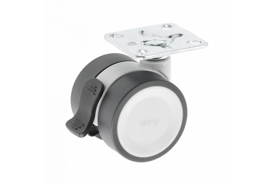 Мебелно колело CIRCO, d-50мм, сиво, със стопер - опора за мобилни мебелни конструкции. Закрепва се към мебели с помощта на метална планка (платформа) 42х42 мм.