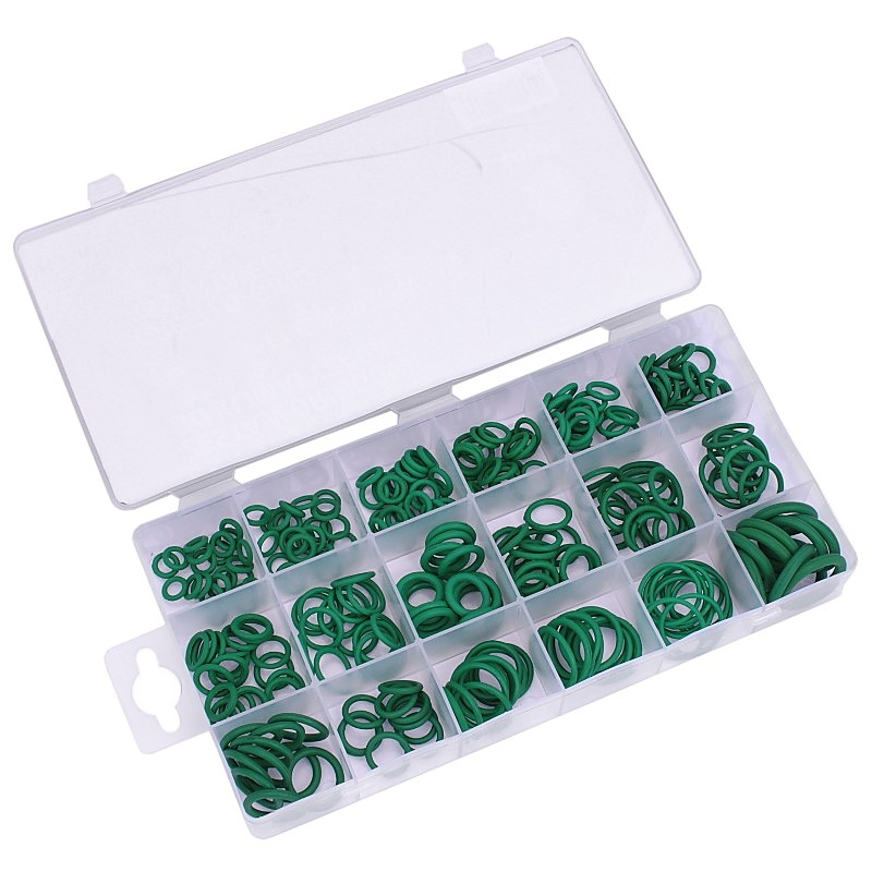 Комплектът О-пръстен за климатизация съдържа 270 елемента в 18 различни размера, осигурявайки цялостно решение за уплътняване на климатични системи. О-пръстените са изработени от HNBR каучук, който се характеризира с висока устойчивост на редица фактори, включително озон, атмосферни условия и различни среди, като охлаждащи агенти, масла и газове. Продуктът е предназначен за работа в широк температурен диапазон от -45°C до +165°C, което го прави надежден при екстремни условия.