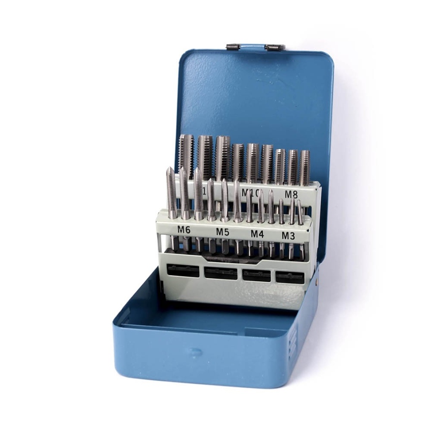 Комплект метчици от инструментална стомана, състоящ се от 21 елемента, е предназначен за груба, фина и довършителна обработка на метрични резби. Комплектът включва метчици с размери M3x0.5mm, M4x0.7mm, M5x0.8mm, M6x1.0mm, M8x1.25mm, M10x1.5mm и M12x1.75mm. Всичко е опаковано в практична метална кутия, която улеснява съхранението и транспортирането.