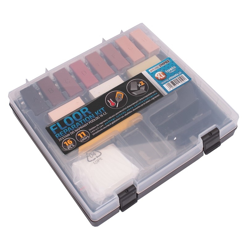 Комплектът за ремонт на подове XL-TOOLS от 16 части е практичен комплект за бързо запълване на драскотини, вдлъбнатини и неравности в ламиниран паркет, паркет, мебели и други дървени и подобни на дърво повърхности. Електрическият, захранван с батерии поялник за восък улеснява прецизното нанасяне и оформяне на пълнители, а 11-те взаимосмесваеми цвята восък ви позволяват да съчетаете нюансите с повечето декори. Това решение „комплект за ремонт на ламиниран и паркетен под“ намалява разходите за подмяна и времето за обслужване.