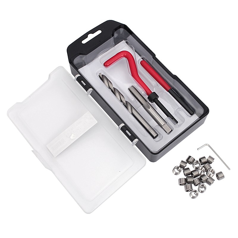 Комплектът за ремонт на резби M 12x1.75 от XL-TOOLS е цялостно решение за възстановяване и укрепване на повредени резби. Комплектът съдържа 15 елемента, включително свредло, метчик, инструмент за монтаж на вложка, щифт за отстраняване на водача на вложката и вложки за ремонт. Това е комплект, предназначен за прецизни ремонтни дейности в различни технически области, включително механични, ключарски и автомобилни услуги. Използването на този комплект позволява бързи и ефективни ремонти, без да е необходимо използването на специализирани инструменти. Всички елементи от комплекта са опаковани в практична опаковка, която улеснява съхранението и предпазва инструментите след работа.