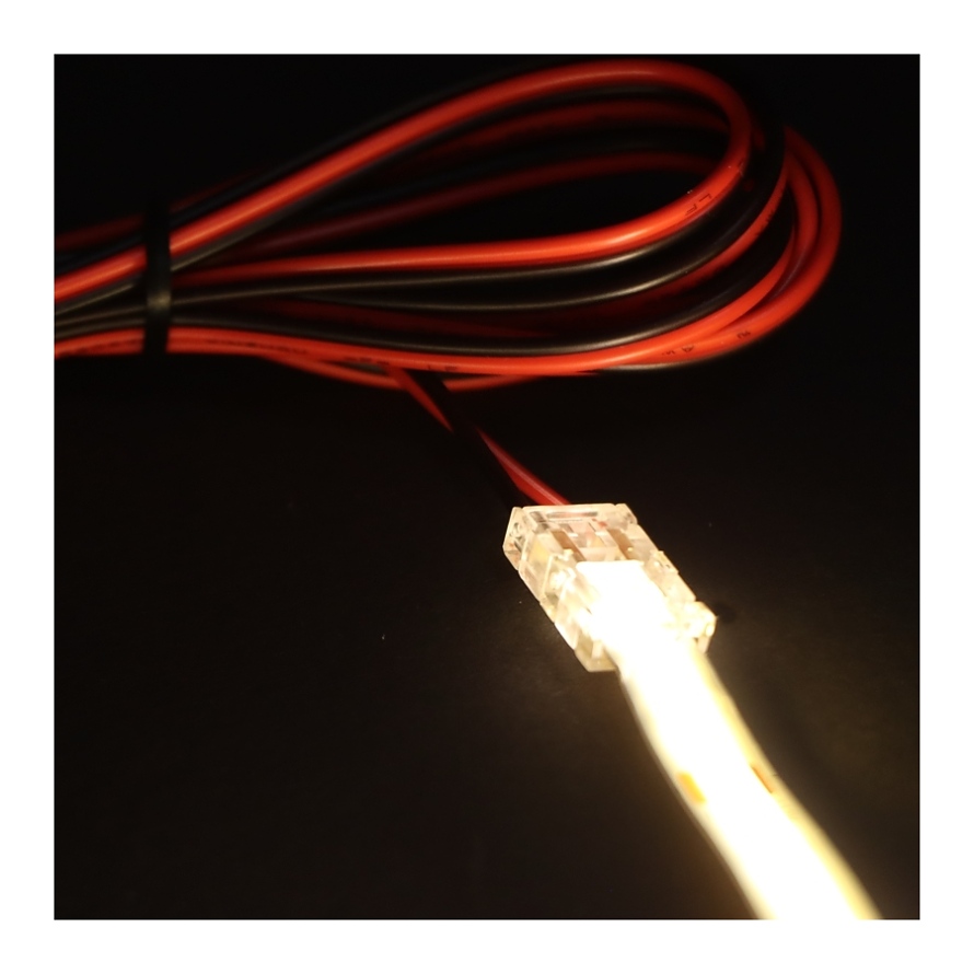 Кабелът ви позволява бързо да свържете 8 mm широка COB LED лента без необходимост от запояване, което често е трудно при свързване на осветление. Просто поставете лентата в конектора и я затегнете. Монтажът е лесен и гарантира издръжливостта на връзката. Кабелът завършва без щепсел за директно свързване към захранването.