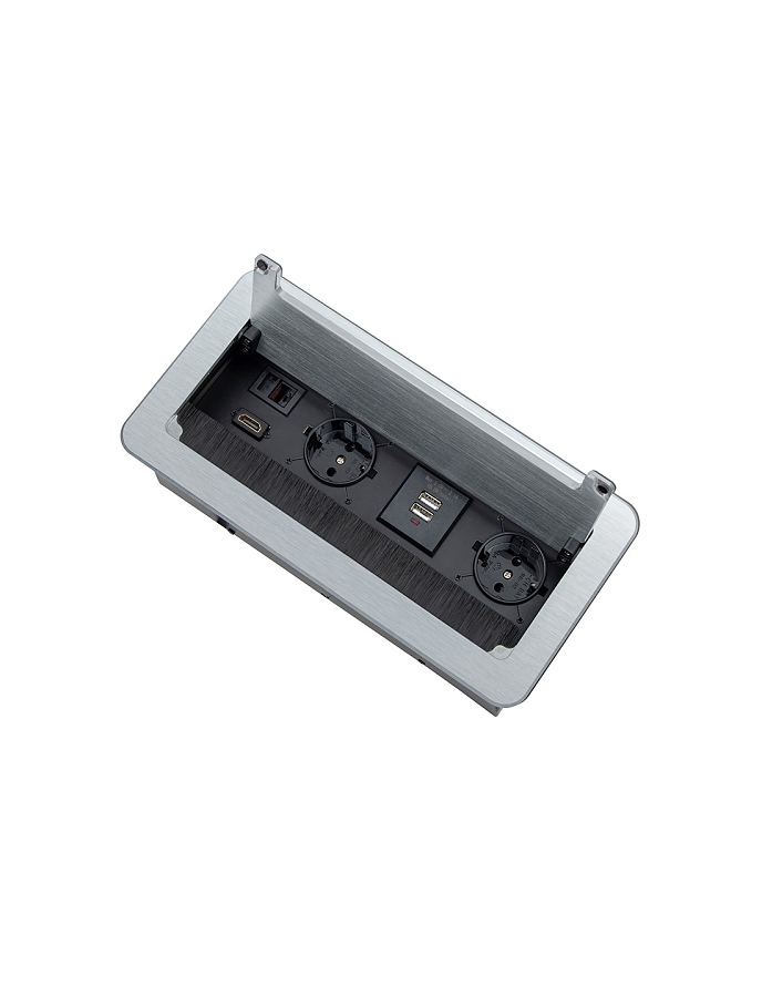 Веднъж монтиран, продуктът е почти невидим върху работния плот. Просто повдигнете корпуса, за да свържете допълнителни устройства, като лаптоп, монитор, DVD или смартфон.