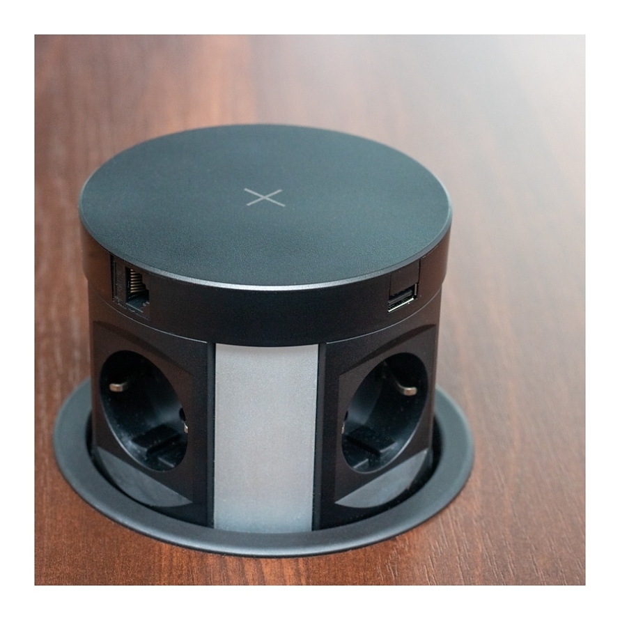 MULTI BOX е модерен контакт за мебели, вграден в кухненски или офис плот с прибиращ се панел. Предлага се в черно и има: