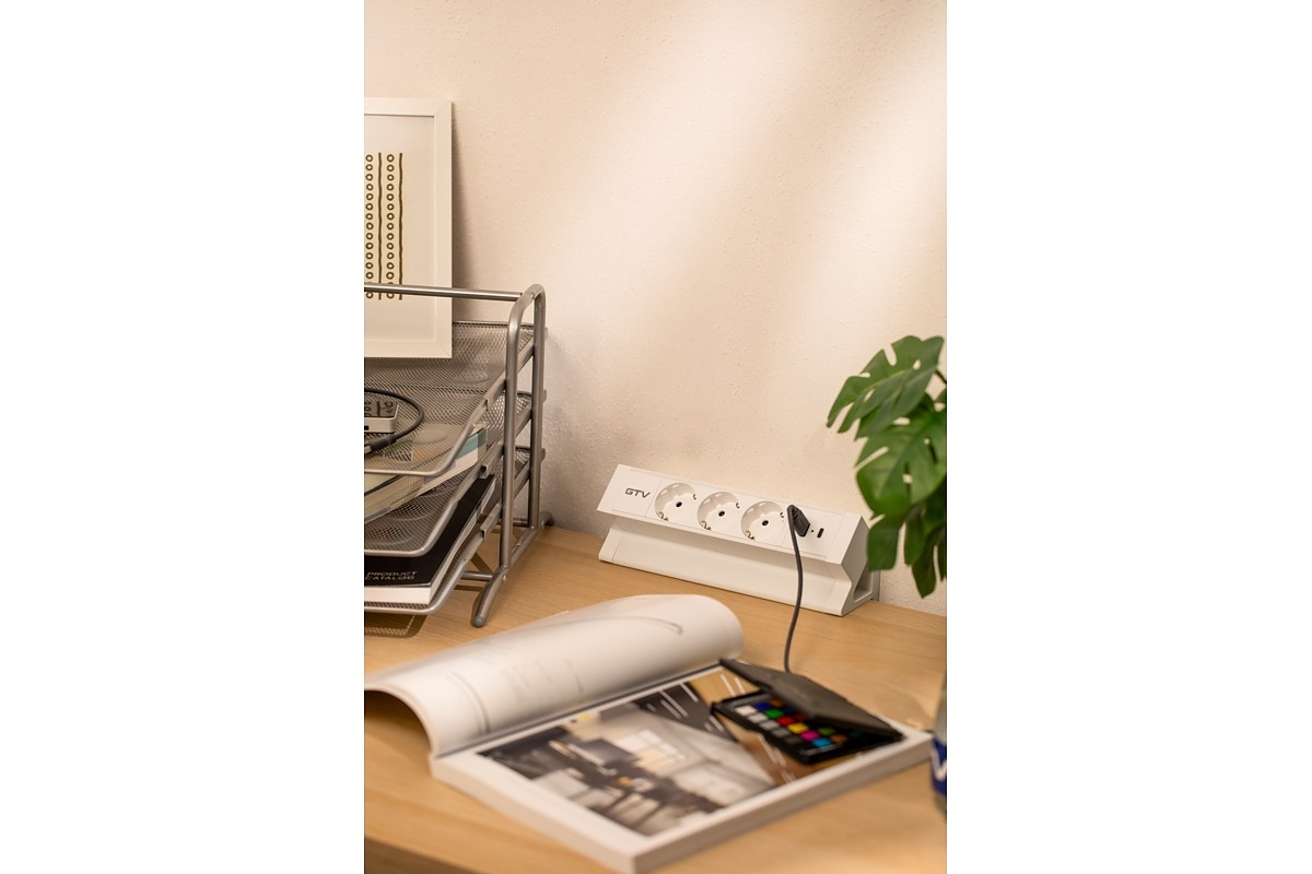 Мебелният контакт BASCO е практично решение за маси и бюра у дома и на работното място. Той улеснява използването на пространството, а универсалният му дизайн се вписва в много аранжировки. Контактът се монтира на ръба на плота на масата с дебелина от 5 до 50 мм – без необходимост от пробиване. Оборудван с три Schuko контакта и USB A и C портове, той ви позволява да свързвате различни устройства едновременно. Разполага с 1,5 м кабел и се предлага в бяло, което го прави дискретно да се слива с повечето работни пространства.