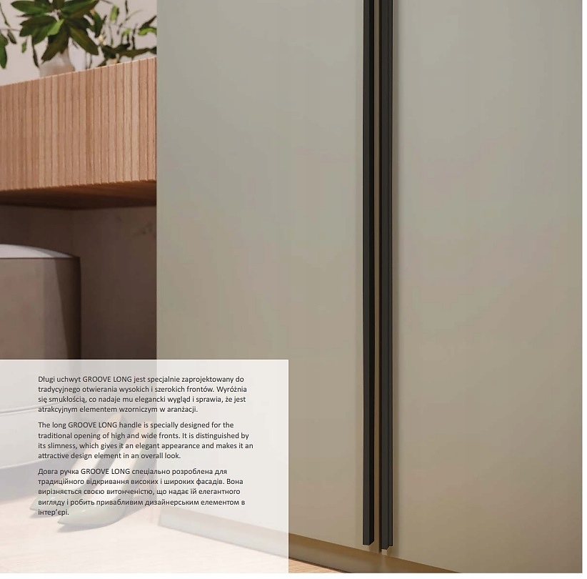 Дългата дръжка GROVE е специално проектирана за традиционно отваряне на високи и широки фронтове. Изработен е от алуминий, което му придава здравина и лекота. Неговата значителна височина от 1200 мм позволява лесно отваряне на високи чела на шкафове или чекмеджета, което е особено практично при по-големи мебели. Дръжката се отличава със своята тънкост, което й придава елегантен вид и я прави атрактивен дизайнерски елемент в аранжировката.