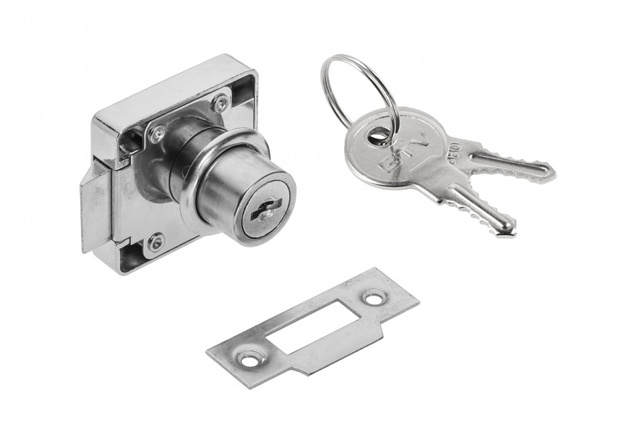Квадратна ключалка с резе, вдлъбнатина, хром. Универсална употреба за офис и домашно обзавеждане. Механизмът за затваряне се осъществява автоматично, когато предната част е затворена към тялото, благодарение на пружина, свързана с езика на ключалката, докато завъртането на ключа прибира резето и позволява предната част да бъде отворена. Комплектът включва 2 стоманени ключа.