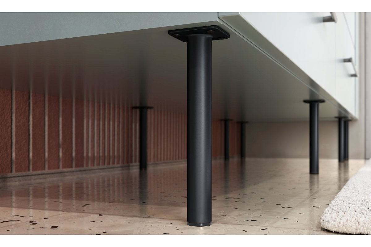 Кръгъл мебелен крак Ronda, изработен от стомана, предлага се в черен мат. Диаметър - 25 мм. Пластмасов предпазител предпазва покритията от случайни надрасквания. Правоъгълна странична монтажна платформа за 4 винта с дебела метална основа. Изглежда модерен и елегантен, подчертава лекотата на мебелите. Ще бъде чудесен в хола за оборудване като скринове, дивани, шкафове.