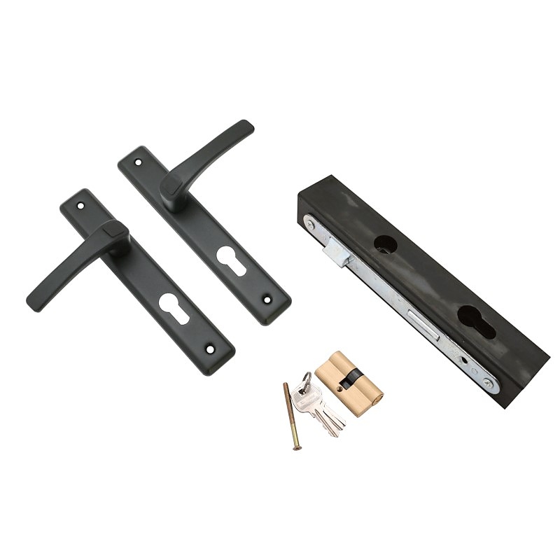 Комплект за порта №1 е пълен монтажен комплект, предназначен за монтаж в портали, порти и оградни врати. Съдържа всички необходими елементи за създаване на функционален и безопасен вход, включително брава, дръжка, цилиндрична вложка и монтажни кутии. Дръжката е изработена от полиамид и има прахово боядисана стоманена плоча, което я прави устойчива на атмосферни влияния и счупване. Поцинкованата и антикорозионна брава позволява отваряне с ключ, а месинговата цилиндърна вложка е снабдена с гъбовидни щифтове, което затруднява манипулацията. Кутията на ключалката е изработена от сурова стомана и е предназначена за заваряване. Комплектът включва и монтажни винтове.