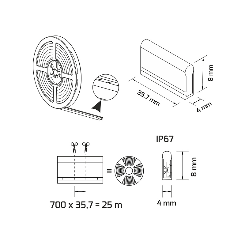 Професионално NEON FLEX LED осветление – модерна, гъвкава LED лента 4x8 мм от Design Light,Идеален за ефективно осветяване на интериори, фасади, мебели и реклами.Благодарение на високата степен на защита IP67, той е устойчив на вода и прах,което позволява употребата както на закрито, така и на открито.LED лентата Neon Flex, поставена в гъвкав силиконов капак, е чудесна алтернатива на традиционните LED ленти.