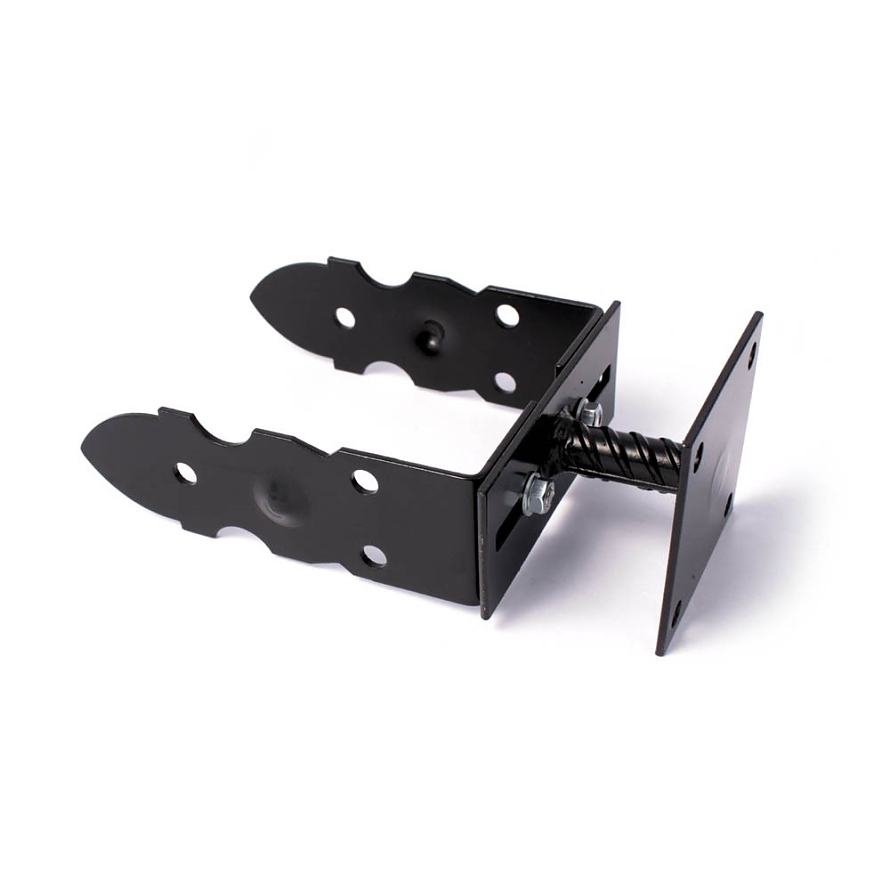Основа за стълб, регулируем крак от 0 до 200 mm, прахово боядисан, декоративен. Продуктът е предназначен за монтиране на дървени елементи върху бетонна основа, осигуряваща подходящо разтояние на дървото от земята. Конструкцията е солидна и здрава, което улеснява монтажа и прецизното напасване към закрепвания материал. Черно прахово покритие и декоративни орнаменти правят продукта идеално съчетан с дърво.