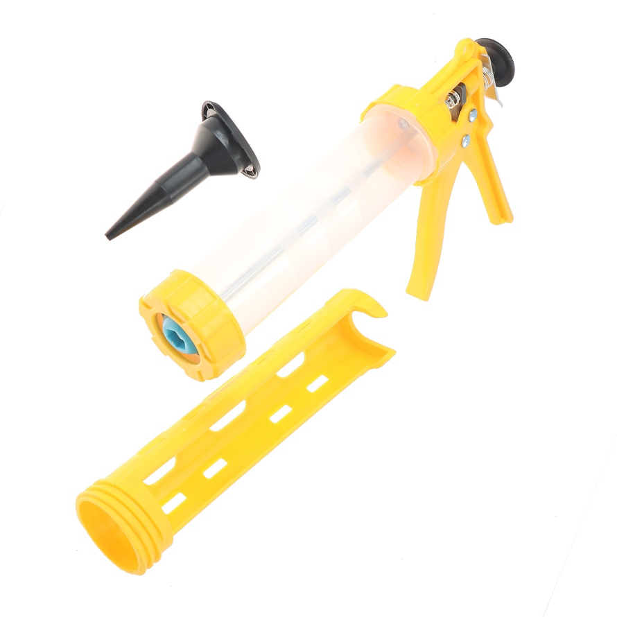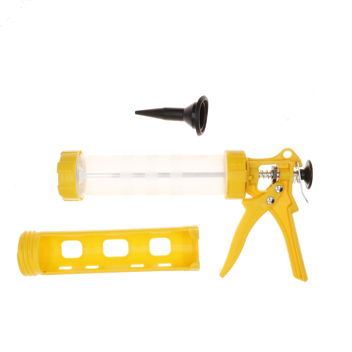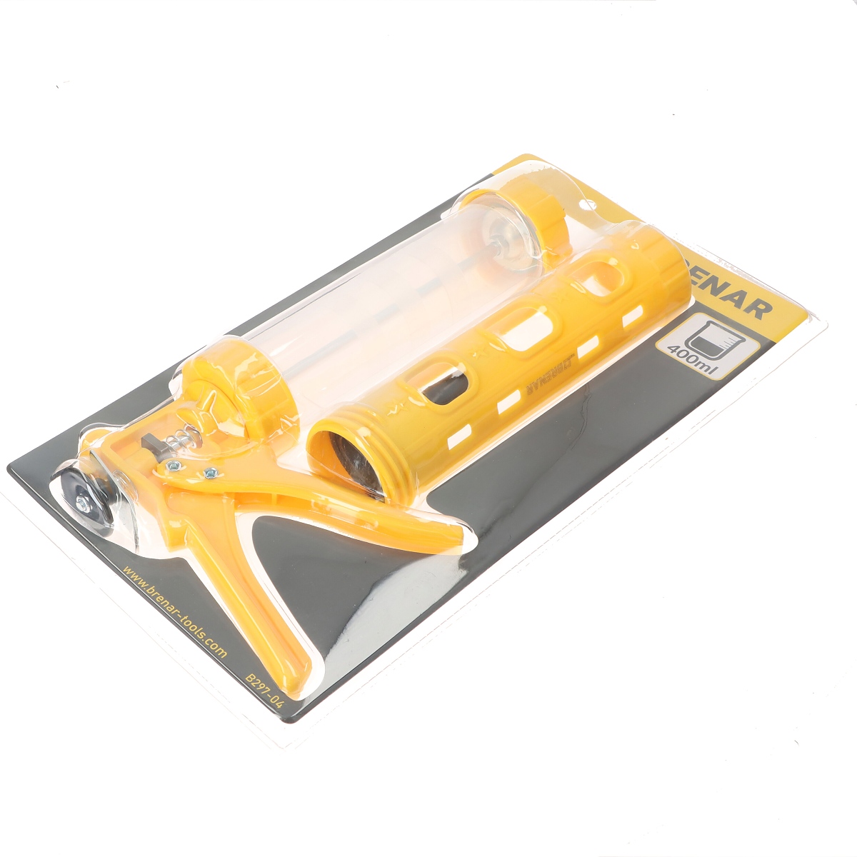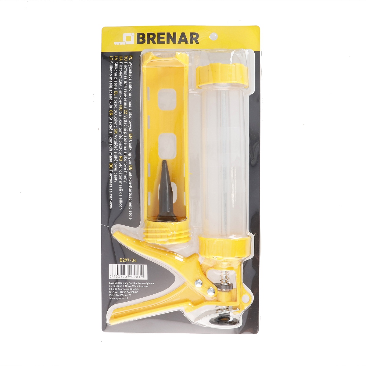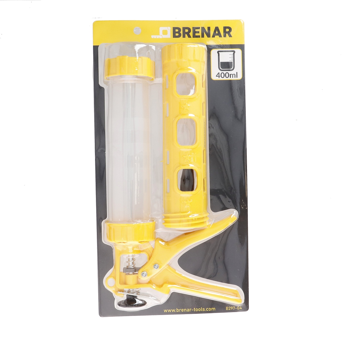 BRENAR B297-04 е екструдер за силикон и силиконова маса с обем 400 мл, инструмент с двойно предназначение, който позволява използването както на силиконови, така и на масови опаковки. Дизайнът му съчетава лекота с издръжливост. Рамката на пистолета се развива, което позволява взаимозаменяема употреба на масови опаковки. Инструментът е изработен от здрава пластмаса, с изключение на екструдиращата част, която е от стомана, осигурявайки прецизно и равномерно дозиране на материала. Здравата конструкция гарантира устойчивост на механични повреди, като същевременно поддържа ниско тегло, което позволява комфортна работа дори при продължителни периоди от време.