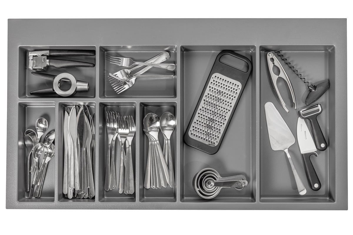 Делителите за чекмеджета Axispace, изработени от висококачествена пластмаса, ви позволяват ефективно да управлявате вътрешността на кухненските чекмеджета. Благодарение на специалните деления, имаме възможността правилно да разделяме и организираме лъжици, ножове, вилици и други полезни кухненски аксесоари. Визуалният ефект обаче не е единственото предимство на този продукт. Вложките за чекмеджета са много обемни и практични и ви позволяват да имате всичко под ръка, което е изключително важно за всеки човек, занимаващ се с готвене.