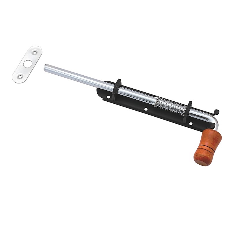 Резето е компактен заключващ механизъм, проектиран за пространства с ограничено пространство за монтаж. Тесният корпус улеснява монтажа върху стоманени профили, рамки и порти, докато пружината поддържа плавно движение на болта. Дървената дръжка подобрява ергономичността на захващането, а черно завършените метални елементи естетически допълват черните конструкции.