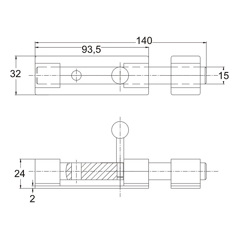 - Размери: обща дължина 140 мм; дължина на основата 93,5 мм; максимална ширина 32 мм; височина 24 мм; дебелина на основата 2 мм; болт 15 мм