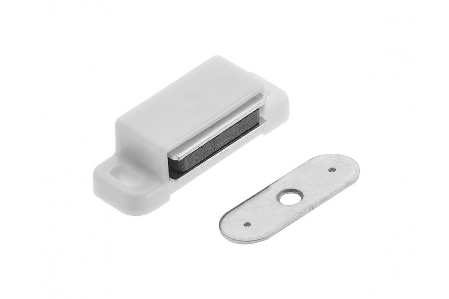 Магнит за мебели в бял или кафяв цвят за шкафове. Корпусът е изработен от пластмаса. В комплекта е включена и плоча, държаща магнита след затваряне на предната част. За техническа карта моля натиснете тук.