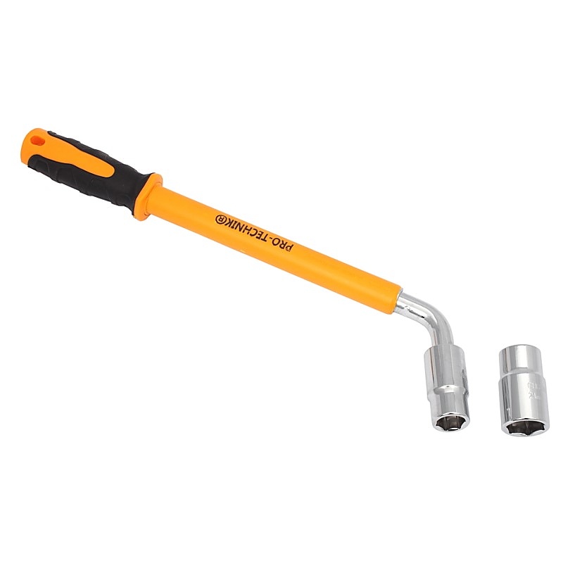 Телескопичният ключ за гуми PRO-TECHNIK е надежден инструмент, който улеснява работата при смяна на колела в леки автомобили. Снабден с телескопичен дизайн, ключът позволява лесно удължаване на лоста до 550 мм, което значително увеличава силата на действие и улеснява развиването дори на силно затегнати болтове. Здравата неплъзгаща се дръжка осигурява здрав захват и предпазва ръцете ви от мазоли, което го прави удобен за употреба дори при продължителна работа. Ключът се доставя с две вложки с размери 17/19 мм и 21/23 мм, изработени от издръжлива CrV хром-ванадиева стомана, което гарантира устойчивостта им на усукване.