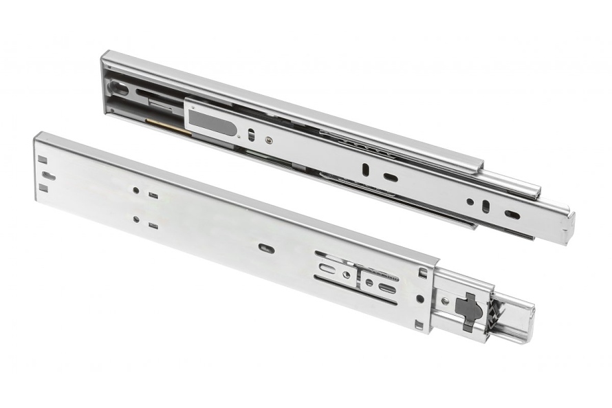 Водач със сачмени лагери със плавно прибиране, изработен от поцинкована стомана за защита от корозия, предлага се в осем размерни варианта. Продуктът ще намери своето универсално приложение за чекмеджета с вдлъбнато и застъпващо лице. Функцията за пълно изтегляне позволява удобен достъп до най-дълбоките места, а безшумното затваряне повишава комфорта при използване. Използването на забавител предотвратява възможни повреди, причинени от рязко затваряне на чекмеджето. Водача има и опция за изваждане на чекмеджето от водача. В допълнение, издръжливостта на продукта е сертифицирана за 60 000 цикъла и издържа на натоварване до 30 кг.