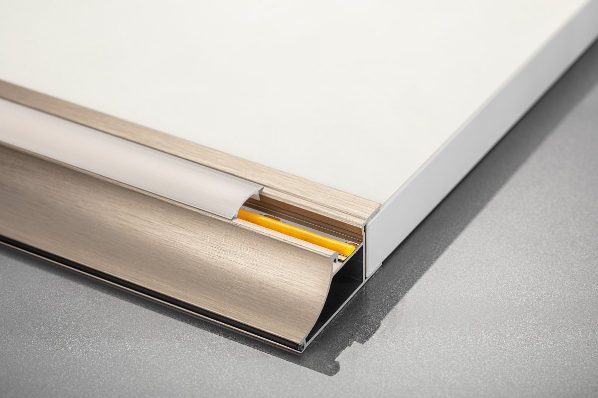Корнизната лайсна е семейство профили с клипсове, така че когато избирате такъв, вземете предвид дебелината на дъската, от която е направена. Профилът може да се използва с дъски с дебелина 18 мм. Когато планирате шкафа, не забравяйте да поставите долната лайсна на 33 мм от корпуса.