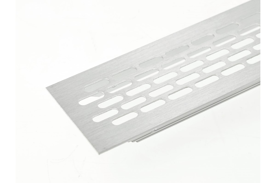 Алуминиева вентилационна решетка в цвят инокс. Вентилационната решетка работи добре при вграждане на уреди за вграждане в кухнята и банята м. вградена фурна, хладилник. Вентилационната решетка осигурява правилна циркулация на въздуха, предотвратява прегряване на мебелите и отлагане на влага в структурата им. Вентилационната решетка е подходяща за монтаж в мебели, но не може да се използва в стени и вентилационни канали.