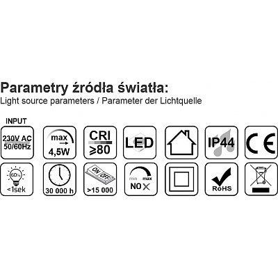 Ниво на сигурност - IP44 (използва се на закрито в стая с повишена влажност)