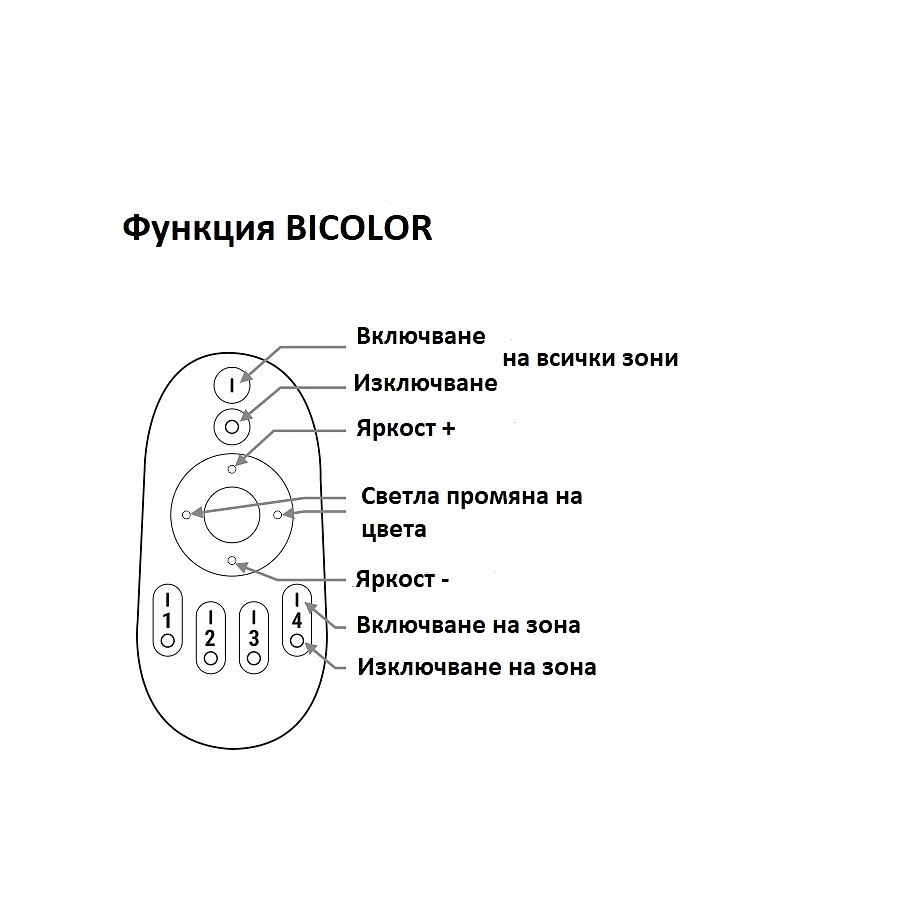 Продукт за едноцветни и двуцветни ленти! Захранване на дистанционното управление: батерии AAA - 2 бр.(батериите не са включени).За упътване и програмиране моля натиснете тук.