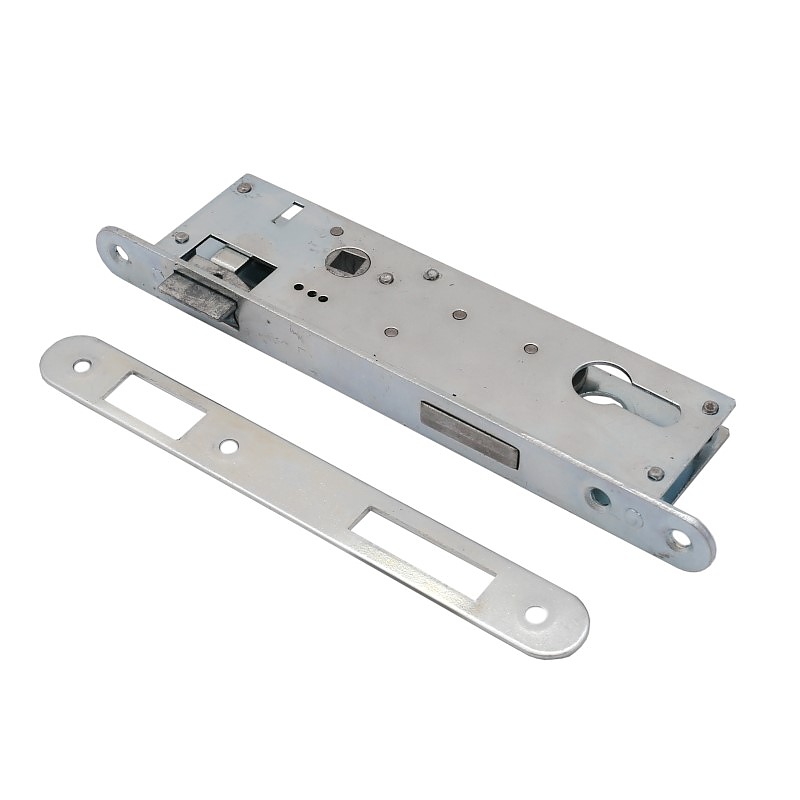 Пакетът включва: брава, комплект монтажни винтове, монтажна рамка от ламарина.