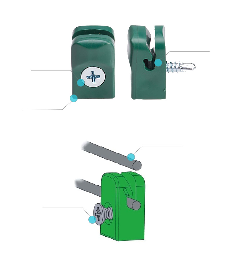 Държач за телени огради от HDPE, стандартни цветове: зелен . Използва се за закрепване на тел при монтаж на оградни мрежи.