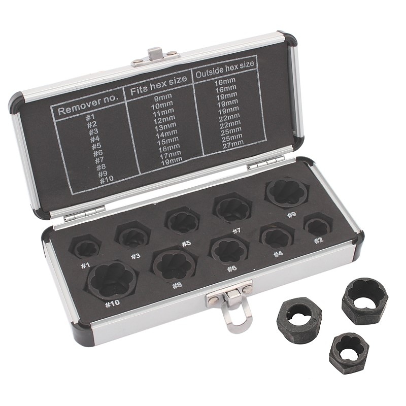 Комплектът екстрактори за счупени болтове и гайки съдържа 10 гнезда, които ви позволяват да премахнете повредени крепежни елементи. Гнездата са съвместими с тресчотка 3/8" и са проектирани да се заклинват върху елемента, който трябва да се развие. Те могат да се използват и с отворени или пръстеновидни ключове. Продуктът се доставя в кутия, която улеснява съхранението и транспортирането му Характеристики