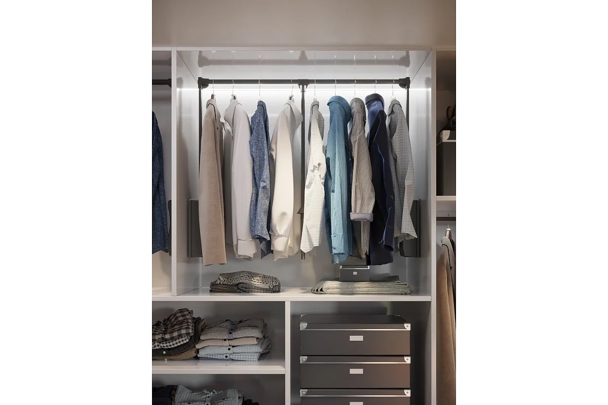 Лифтът е елемент от гардеробното оборудване, без който би било трудно да се използват високите части на гардероба. Идеален за окачване на якета и зимни палта, които искаме да съхраняваме през лятото, за да не пречат на ежедневната употреба на гардероба. От своя страна, за зимата можем да сложим дълги, летни рокли върху него. Лифтът GTV с маслен амортисьор е решение за всеки тип гардероб – отворен и затворен, включително част от стая или отделна стая. Дрехите, изложени на закачалки, поставени на лентата на лифта, изглеждат елегантно и с вкус.