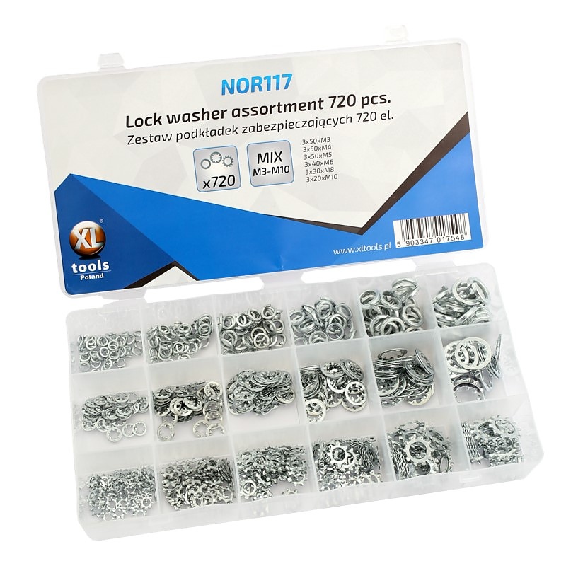 Комплект от 720 броя поцинковани шайби в 3 вида. Комплектът включва пружинни шайби, кръгли пружинни шайби с вътрешни назъбвания и кръгли пружинни шайби с външни назъбвания. Незаменим във всяка работилница. Опаковани в прозрачен органайзер с отделения за сортиране на размери.