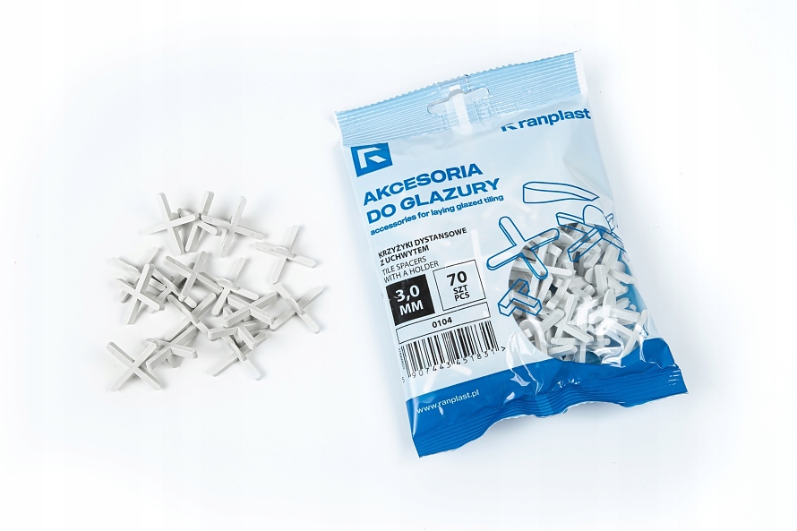 Дистанционери за плочки RANPLAST за употреба върху подове и стени при полагане на плочки. Изработени от бяла пластмаса за многократна употреба.