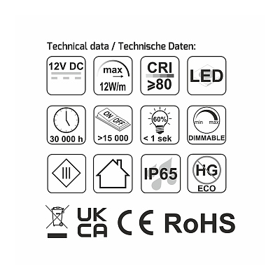 Данни за лентата на 0,5 m: 30 LED, 6W, 550 lm, IP65 (BC 540 lm, BN 540 lm, BZ 540 lm) Данни за лентата за