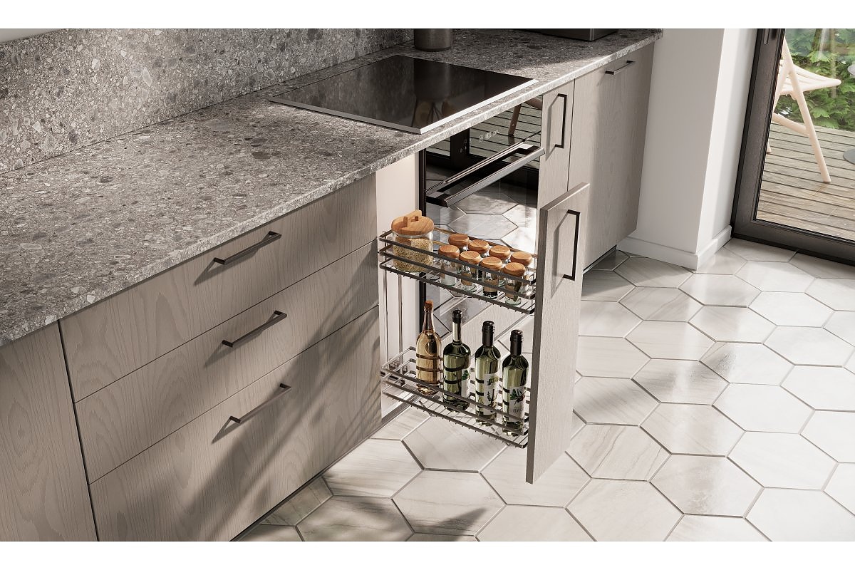 Кухненските мебели, оборудвани с карго, т.е. прибираща се система с рафтове, са отлични за съхранение на повече продукти и хранителни запаси. Те заемат сравнително малко място, но сами по себе си са много просторни. Възможността за плъзгане на цялото съдържание на шкафа навън улеснява разделянето и осигурява лесен достъп до всички продукти, поставени на рафтовете. Подплотната система се предлага в хромиран цвят, издържа на натоварване до 15 кг и се отличава с ажурно дъно. Специалните долни водачи за монтаж гарантират пълно изтегляне, безшумна функция на затваряне и висока работна култура. Закрепването към стените на корпуса и към предната част на шкафа осигурява стабилността на конструкцията, а регулирането в три равнини улеснява процеса на сглобяване. Едностранен монтаж в зависимост от избора на водачи (комплектът не включва водачи). Поръчват се допълнително.