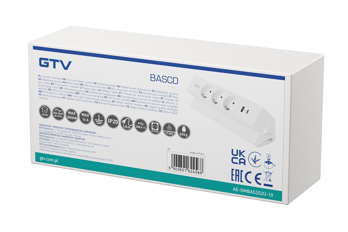 Мебелният контакт BASCO е практично решение за маси и бюра у дома и на работното място. Той улеснява използването на пространството, а универсалният му дизайн се вписва в много аранжировки. Контактът се монтира на ръба на плота на масата с дебелина от 5 до 50 мм – без необходимост от пробиване. Оборудван с три Schuko контакта и USB A и C портове, той ви позволява да свързвате различни устройства едновременно. Разполага с 1,5 м кабел и се предлага в бяло, което го прави дискретно да се слива с повечето работни пространства.