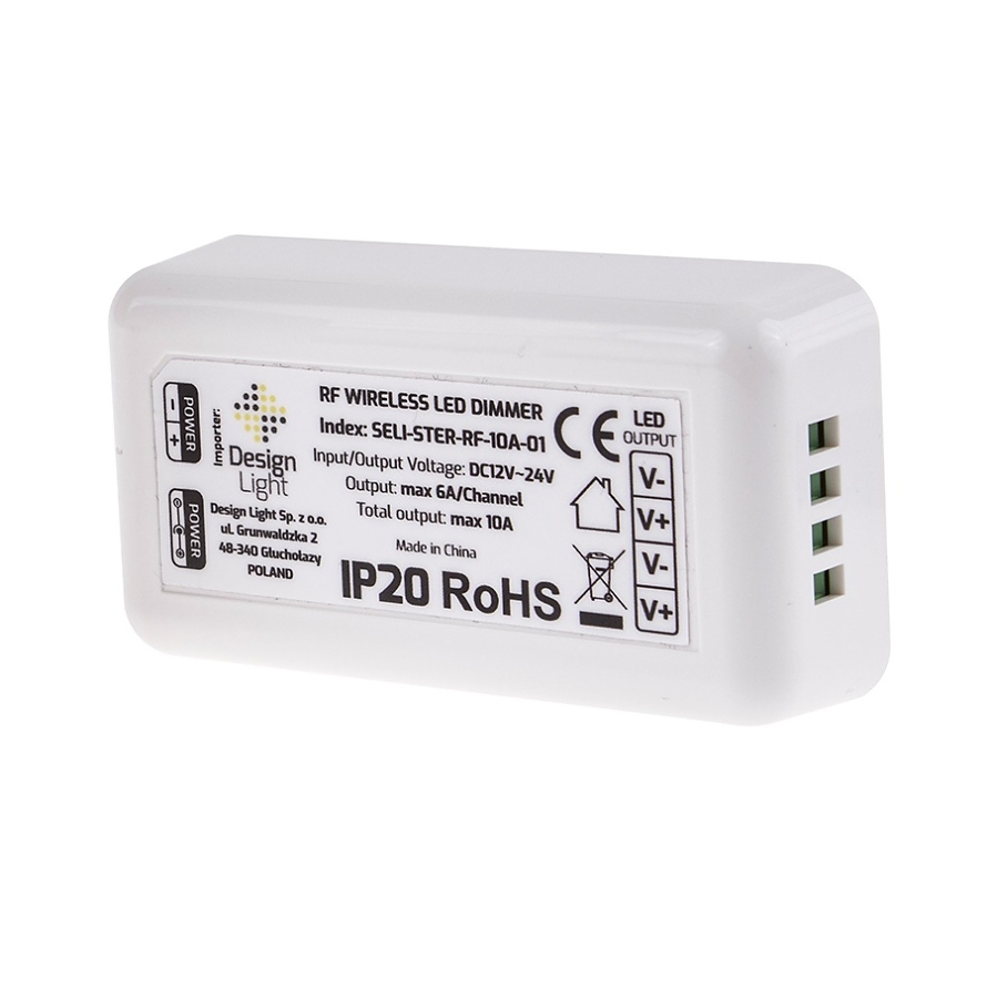 RF драйверът е еднозонов драйвер за моно LED ленти. Като го свържете към комплекта SELI, можете да създадете комплект, състоящ се от 1 дистанционно управление и до 4 контролера.