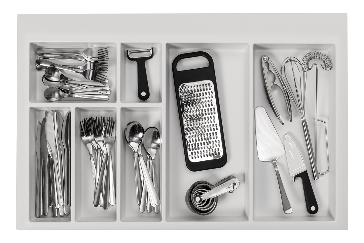 Делителите за чекмеджета Axispace, изработени от висококачествена пластмаса, ви позволяват ефективно да управлявате вътрешността на кухненските чекмеджета. Благодарение на специалните деления, имаме възможността правилно да разделяме и организираме лъжици, ножове, вилици и други полезни кухненски аксесоари. Визуалният ефект обаче не е единственото предимство на този продукт. Вложките за чекмеджета са много обемни и практични и ви позволяват да имате всичко под ръка, което е изключително важно за всеки човек, занимаващ се с готвене.