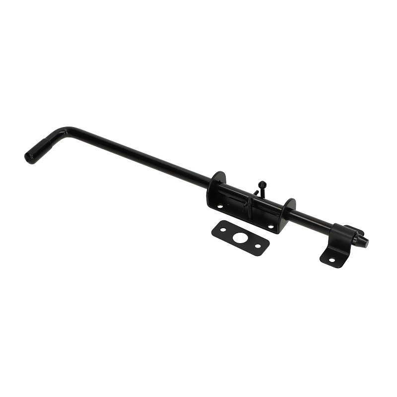 Стоманено резе за обезопасяване на врати, порти и портали. Тясната основа от 40 мм позволява монтаж върху профили с диаметър 40 мм и по-широки, което улеснява използването на тесни стълбове и рамки на вратите. Прътът с диаметър 14 мм и общата дължина от 420 мм осигуряват сигурно заключване. Черното прахово покритие допълва дървената дограма и модерните цветове на стоманените огради, като графит или антрацит. Комплектът включва два фитинга, от които да избирате, в зависимост от начина на монтаж и мястото на заключване: за повърхностен монтаж (извит) и за вграден монтаж (плоча с отвор) за заключване в рамка на вратата, стена или под. Монтаж с винтове.