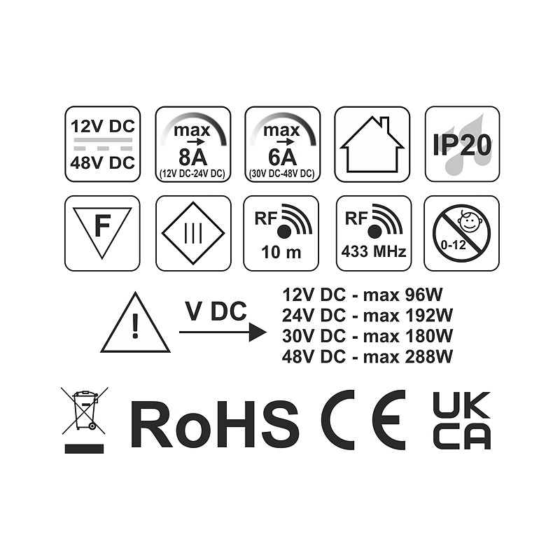 VIVO RF MONO контролер, бял, 12-24V DC 8A, 30-48V DC 6A