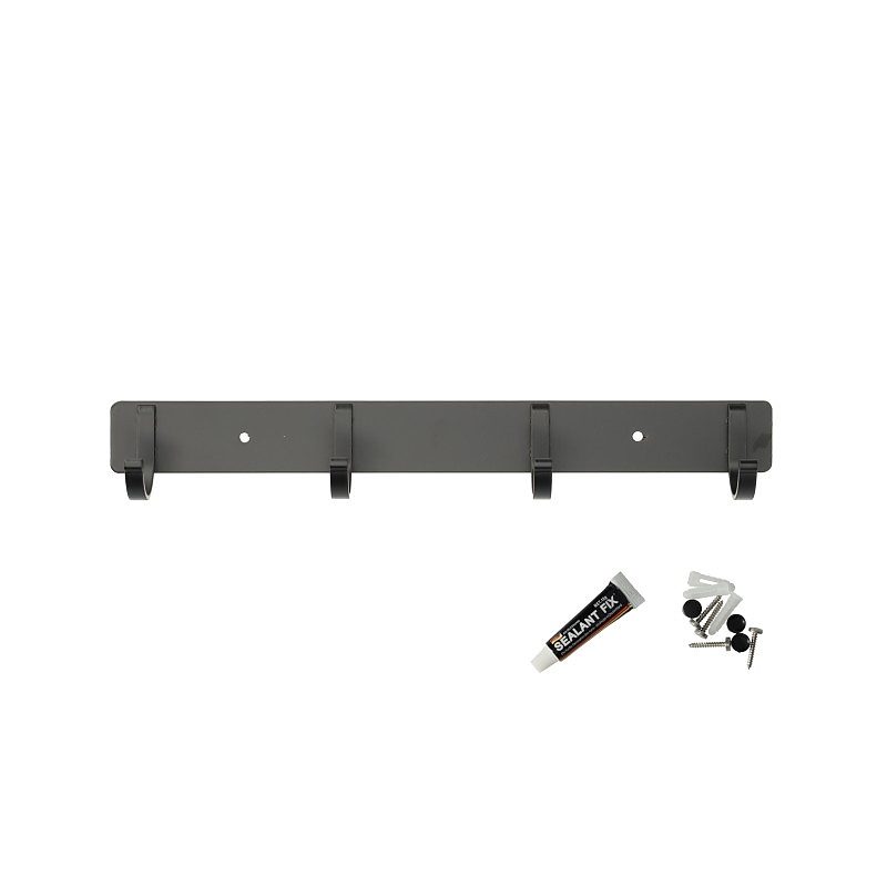 Тази здрава стоманена стойка с 4 куки ви позволява бързо да организирате най-често използваните си аксесоари. Универсалният му черен цвят и включеният комплект за монтаж го правят лесен за поставяне в различни пространства. Практичен избор за дома, работилницата и сервизните помещения.